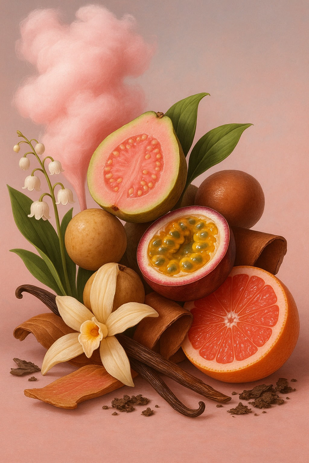 Top: Guava, Longan, Passionfruit, Grapefruit Heart: Cotton Candy, Lily of the Valley, Leather Base: Vanilla, Musk, Patchouli